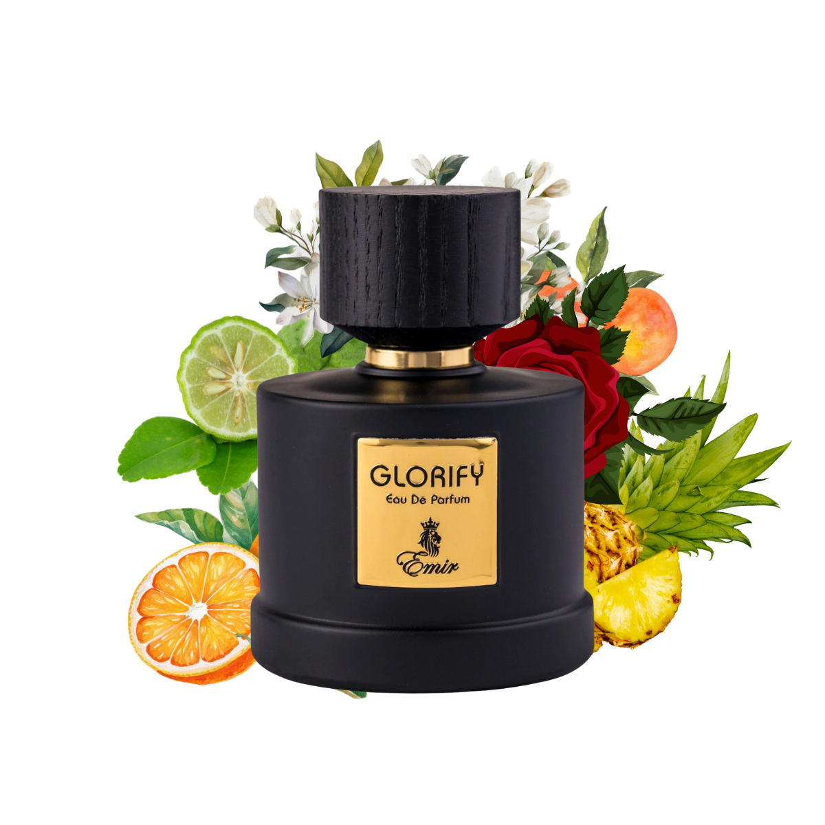Glorify EDP Emir Series is a fragrance that transcends the boundaries of gender, offering a symphony of scents that captivate both men and women. From the very first notes, a vibrant concoction of pineapple, orange, bergamot, and mandarin dances on the skin, showering the senses with an invigorating and fruity freshness.