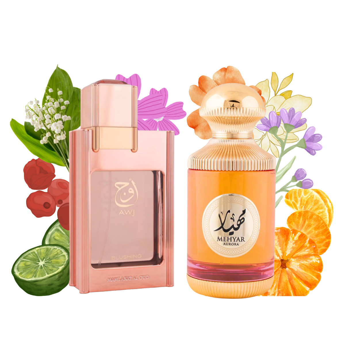 Together, AWJ Blushing & Fleur Mehyar Aurora form a luxurious pairing—one exuding floral sweetness and sensual charm, the other radiating luminous elegance and bold allure. A perfect bundle for those who desire versatility, sophistication, and unforgettable presence in every moment.