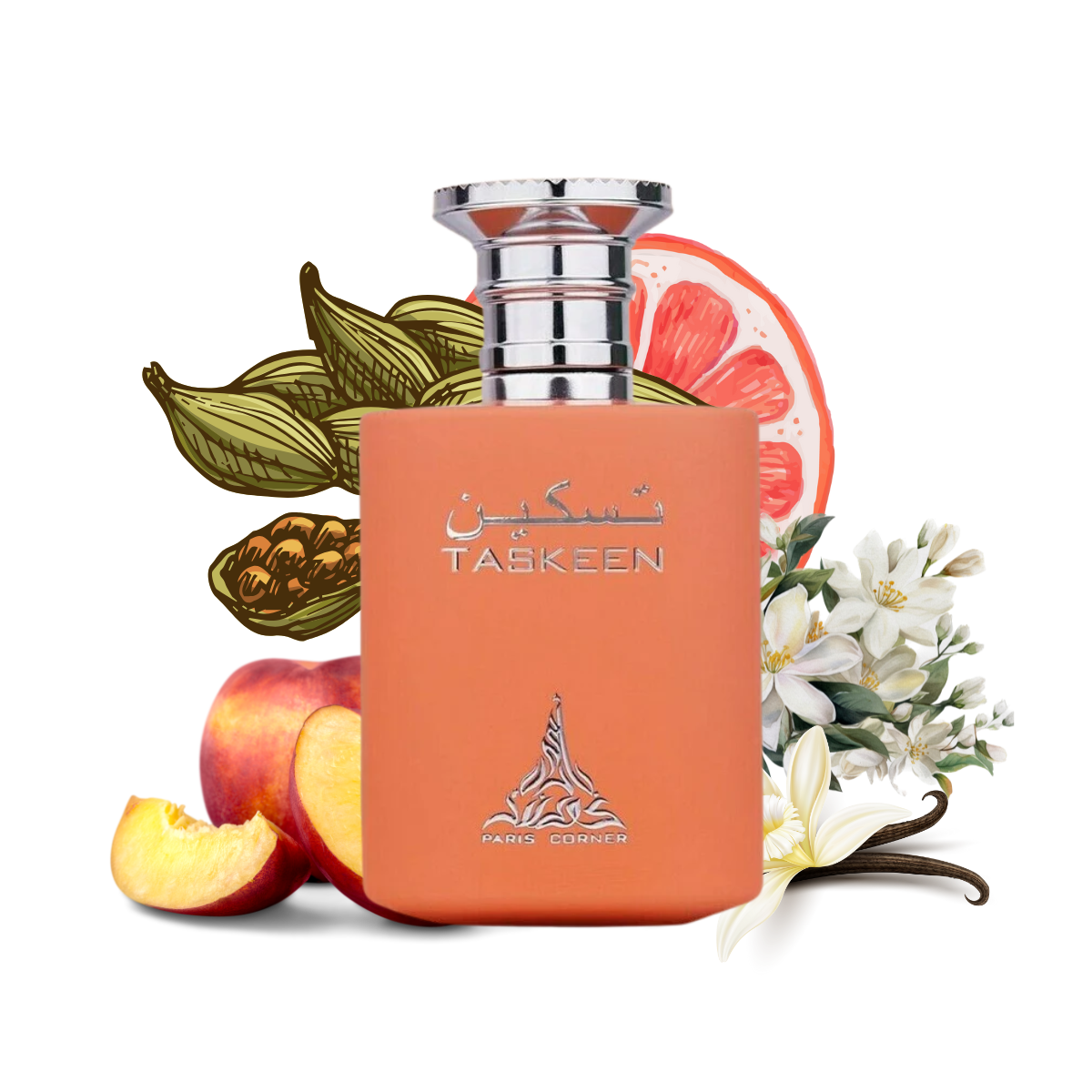 As it settles, Taskeen Peach unveils a plush base of sandalwood, vanilla, and tonka bean, layered with benzoin, cashmeran, labdanum, and patchouli—a rich, creamy dry-down that lingers with sophistication and softness.